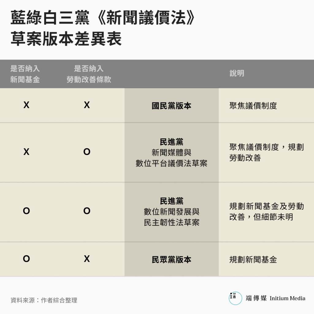 目前,台灣的三個主要政黨在立法院共提出六個版本的「新聞議價法」草案,皆參照澳洲模式的議價制度,明文規定新聞媒體可向數位平台經營者提出議價請求,未能達成協議時得向主管機關申請調解與最終仲裁。草案亦規範Google、Meta等海外數位平台,需於台灣境內指定法定代理人,處理議價相關事務。