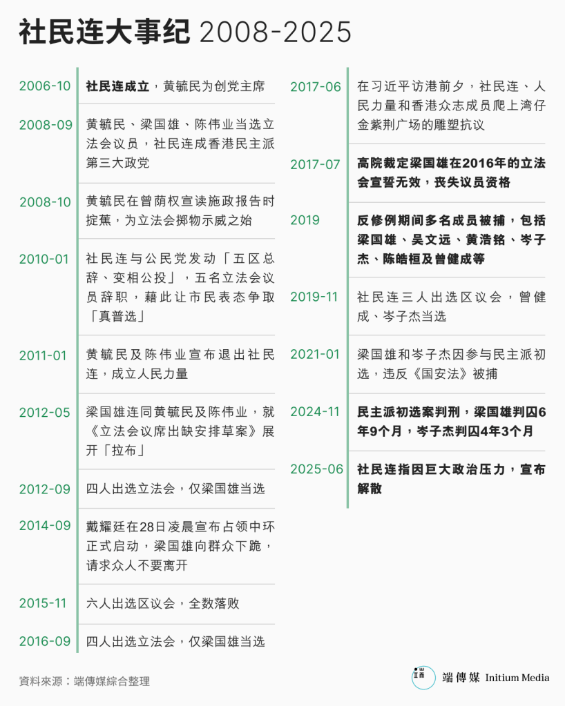 在2014年后,香港社会弥漫无力感,示威游行人数下降,直到2019年的反修例运动,香港社会运动的能量才重新聚集。在历时多月的抗争中,多位社民连成员官司缠身。当中,参与民主派初选的梁国雄和岑子杰被判违反国安法“颠覆国家政权”罪成,梁国雄被判监禁6年9个月,仍在服刑;副主席岑子杰,被判刑4年3个月,刚在2025年5月底刑满释放。