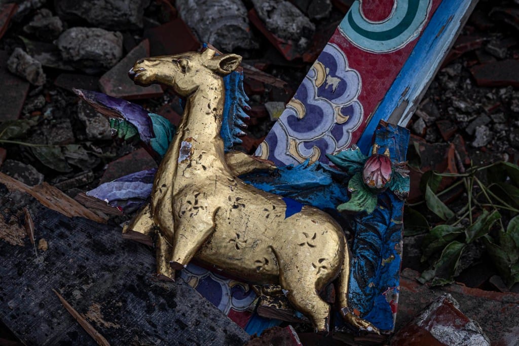 2025年7月7日,台南南鯤鯓代天府,颱風下,以十二根千年檜木興建的牌樓倒塌,滿地殘骸。摄:陈焯煇/端传媒