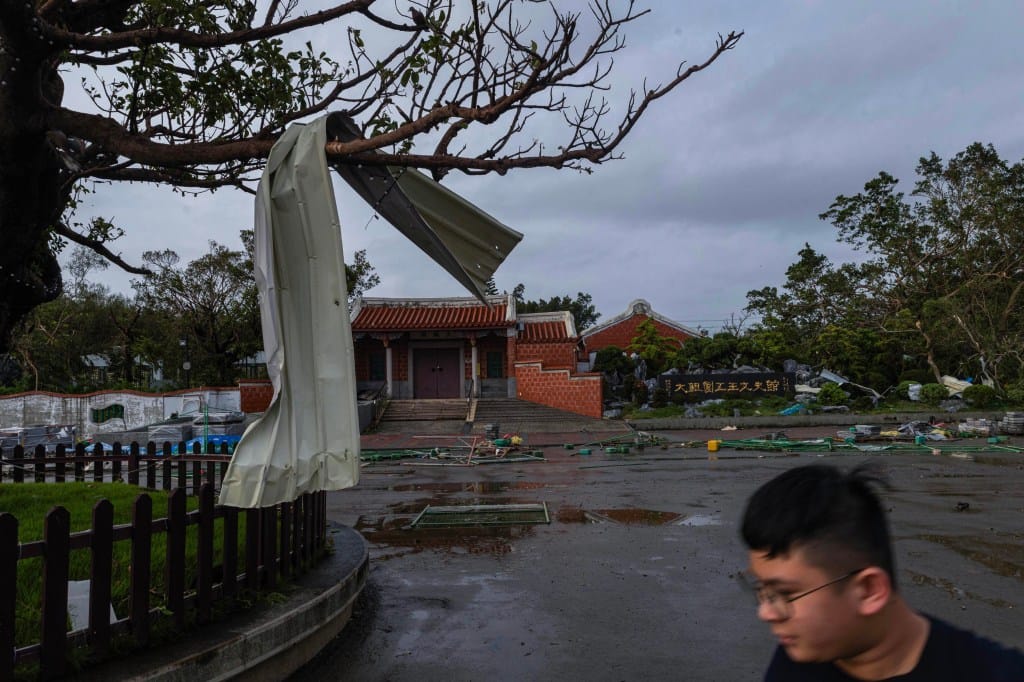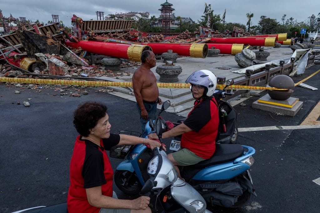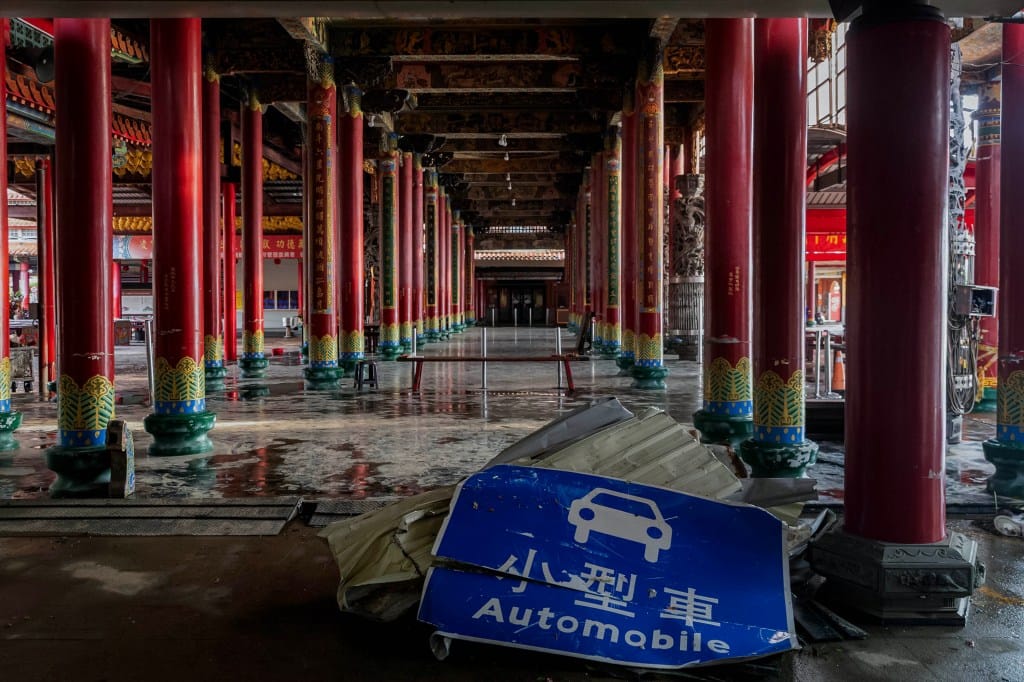 2025年7月7日,台南,台风吹袭后的南鲲鯓代天府,民众经过一个倒下的广播台。摄:陈焯煇/端传媒