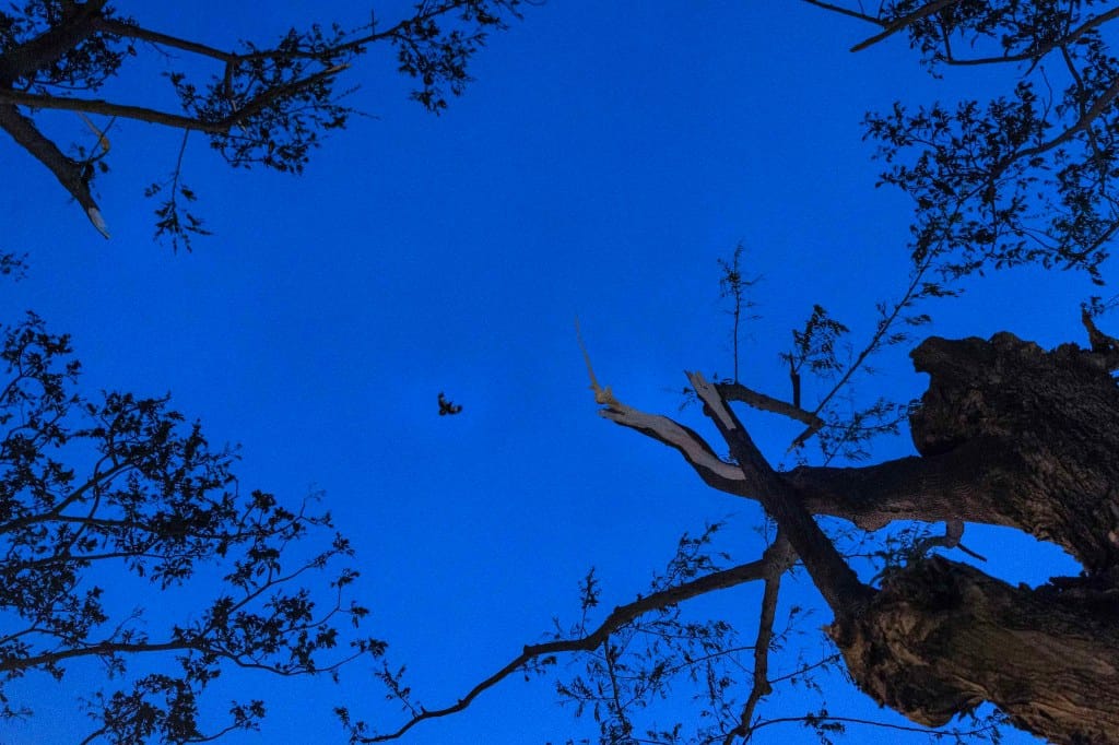 2025年7月7日,嘉义,鸟飞过被台风吹断的树枝。摄:陈焯煇/端传媒