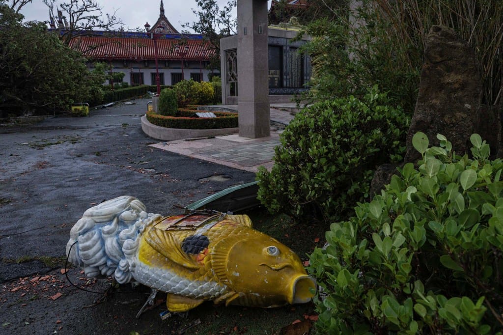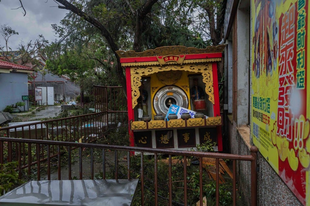 首當其衝的台南市區,今晨市容滿面瘡痍,大量路樹倒塌、鐵皮屋傾斜的狀況,北門南鯤鯓代天府前的大牌樓亦被強風吹垮,廟裡大淹水。廟方指出,該牌樓有40多年歷史,由12根價值不菲的千年檜木,以古早工法所建造,但因基座較淺、加上年久材質可能腐朽,終不敵強風而倒塌。廟方未來也將設法重建。