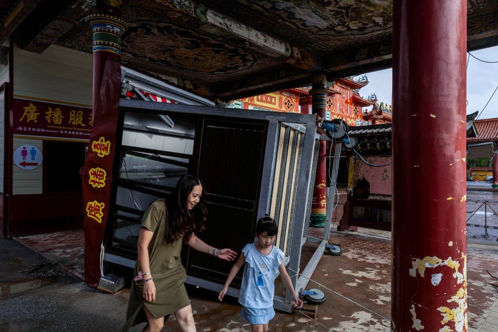 2025年7月7日,台南,颱風吹襲後的南鯤鯓代天府,民眾經過一個倒下的廣播臺。攝:陳焯煇/端傳媒