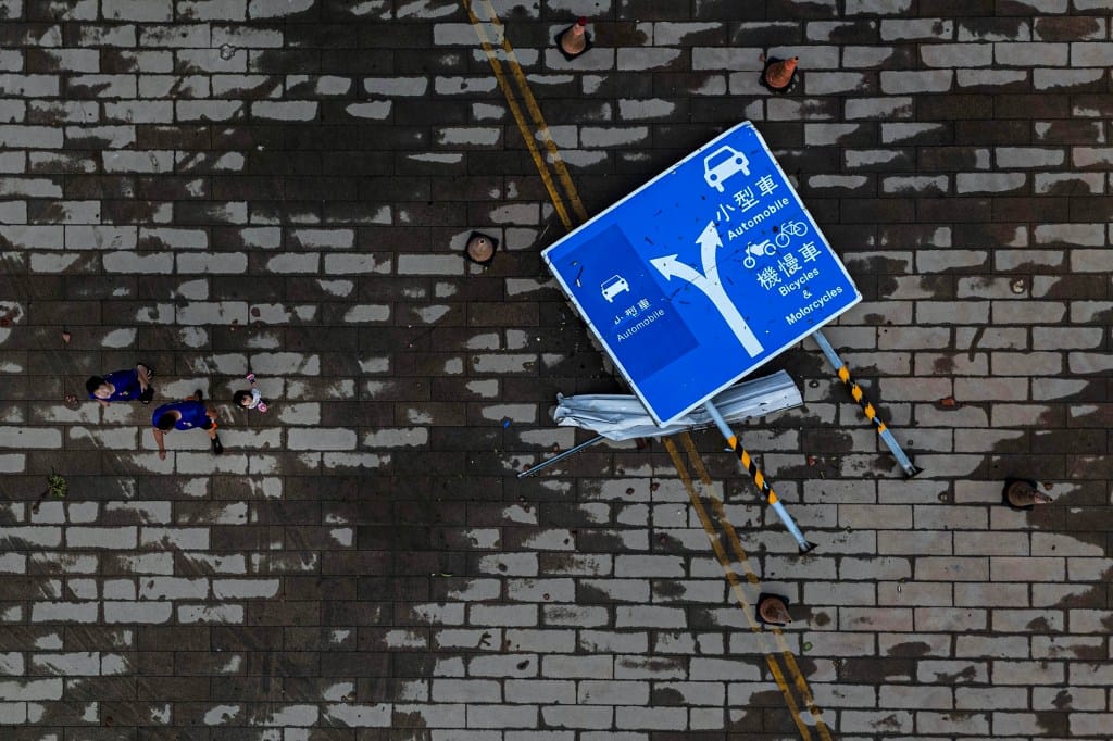 2025年7月7日,台南,颱風吹襲後的南鯤鯓代天府,一個路牌被吹倒。攝:陳焯煇/端傳媒