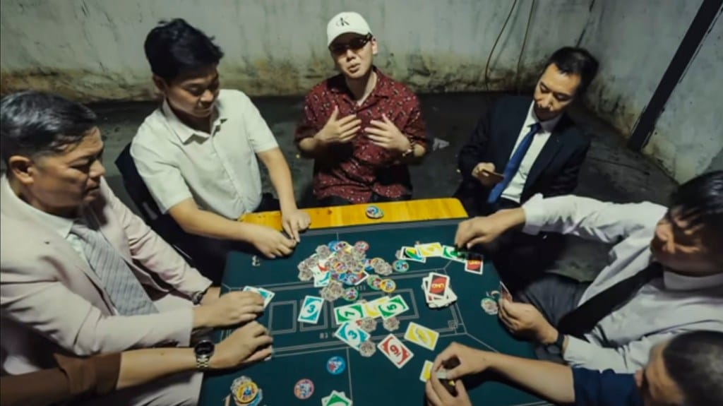 但很難說攬佬的創作是不是鼓勵這種形象,我只能說他展示了這種形象。歌曲中是否存在批判和反思,也是一個在網上不時爭吵的話題。至少如十分熱門的《八方來財》MV,和他的另一首歌《因果》連在一起,用轉瞬改變的採樣和場景串聯起來。上一秒還在酒局、牌桌上財大氣粗地推杯換盞,鏡頭一轉,歌手帶着手銬出現在彷彿天庭轉生的山林之間。「魑魅魍魎總出現在秋收後」,「世界上條條框框,就好像打牌記賬,遲早會到你頭上⋯⋯殊不知,天在看」,前半首MV光鮮亮麗坑蒙拐騙那個人,如今已經身陷囹圄。