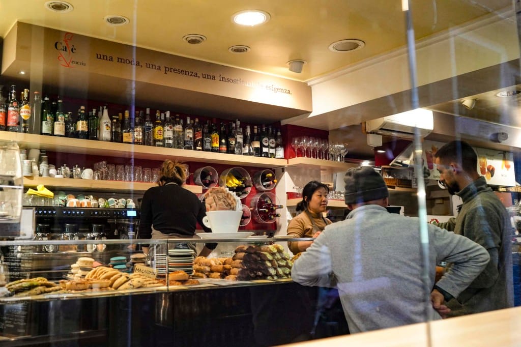 Bar Foscarini開在威尼斯著名景點學院橋旁邊,已有70多年的歷史。它看起來是再典型不過的意式咖啡吧:裝潢是典雅的意大利傳統風格,長長的深色大理石吧檯一側放着擦得錚亮的咖啡機。菜單上是意式咖啡、調酒,還有意面和披薩等簡餐。