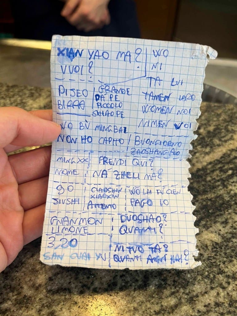 在他的錢包裏,藏了一張小抄,上面了寫滿常用句子的中文發音,其中一句是「我來付錢」。Alessio仍搞不清楚,為什麼中國人總愛爭着結賬。