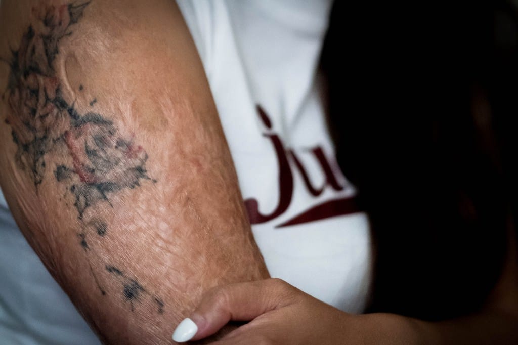 「我本來選了一塊沒有被燒到的皮膚,結果被刺青師痛罵一頓,」刺青師說她身上完好的皮膚所剩無幾,好好一塊皮膚還要拿去刺青,「真的是頭殼燒到壞去!」
