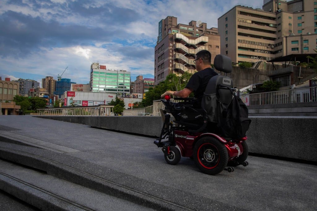 我們陪著他穿上義肢,坐上電動輪椅到戶外拍攝,拍攝到一半,他突然回頭對我笑笑說道:「今天的照片可以給我嗎?畢竟我的手沒辦法(拿手機)自拍。」