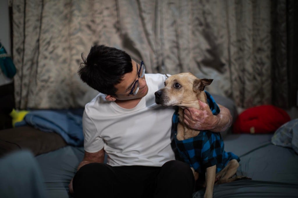 我們先聊到他養的狗「牛仔」(gû-á,台語發音),林祺育擔心快17歲的牛仔身形太過削瘦、不好看,邊為牠穿上件黑藍相間的衣服,說牛仔出門經常被問「牠好瘦呀,怎麼那麼瘦啊」。他說,也許是自己內心的投射吧,「受傷前,我有在健身,身型壯碩,結果去玩個水出來就變成這樣,全身黑黑醜醜,疤痕長出來後更讓人無法接受。」