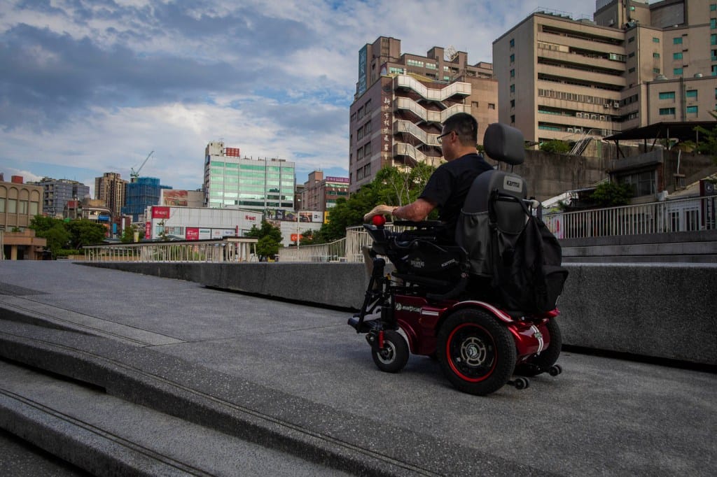 我们陪著他穿上义肢,坐上电动轮椅到户外拍摄,拍摄到一半,他突然回头对我笑笑说道:“今天的照片可以给我吗?毕竟我的手没办法(拿手机)自拍。”