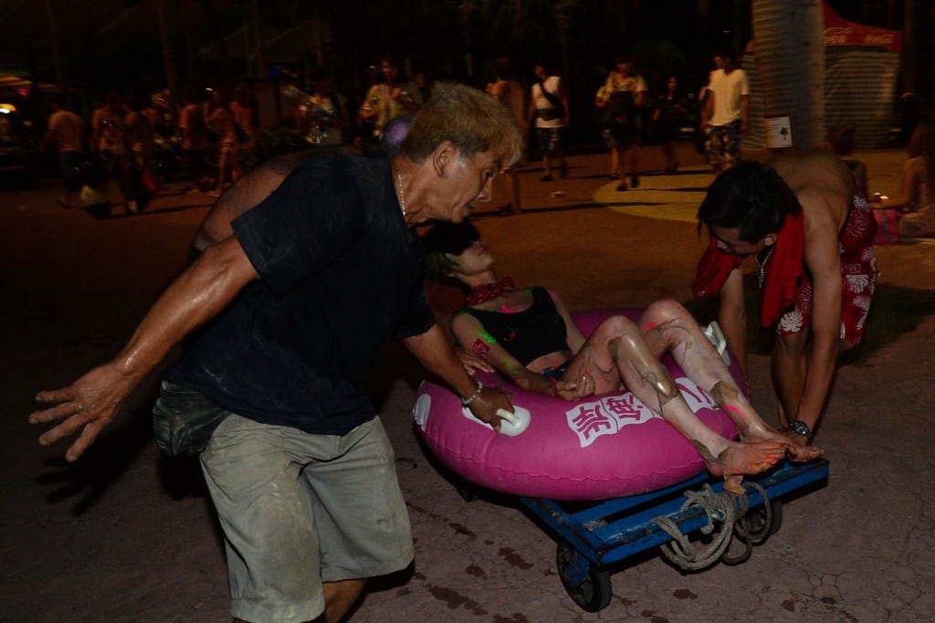夜晚的八仙乐园一阵骚动,一旁的游客都挤到事发水池,协助将烧伤的游客放到充当担架的八字形泳圈上,再以人力徒步穿越800公尺送至不得其门而入的救护车。那晚,救护车的鸣笛声响彻海岸边际的公路,一辆辆救护车奔驰而去,交错另一辆赶往现场。