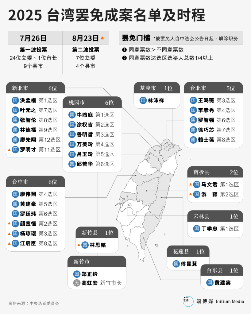不过,罢免案通过有一定门槛,需同时符合同意票高于不同意票,及25%得票门槛等条件。一旦罢免成功,该立委职位将空缺,直到补选完成。同时,立委被免职后,不得于四年内在原选区参选,但可跨区参选。