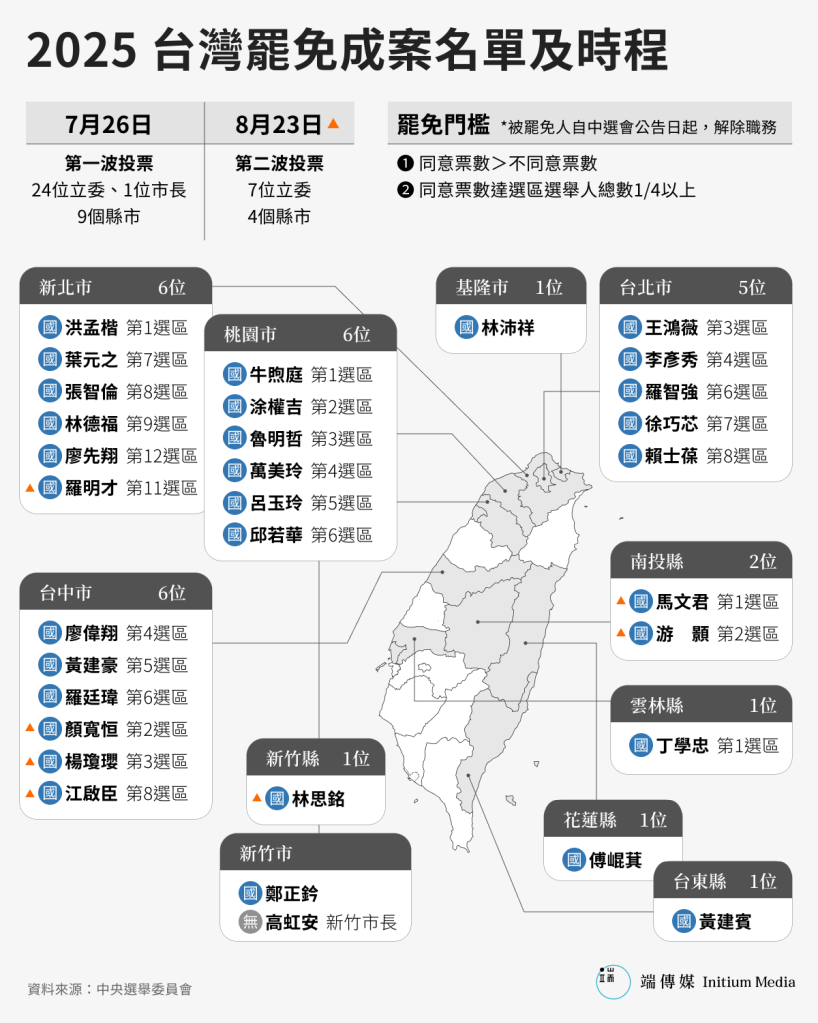 台灣史上規模最大的「大罷免」投票即將登場,首波罷免投票將於7月26日舉行,共有24位立法委員及新竹市長高虹安等案進行投票,第二波投票將在8月23日舉辦,共有七名立委與「重啟核三公投」同步展開。這波全台大罷免成為台灣上半年以來最受矚目的政治焦點,投票結果不僅可能重塑國會版圖,也考驗政黨回應民意的能力。