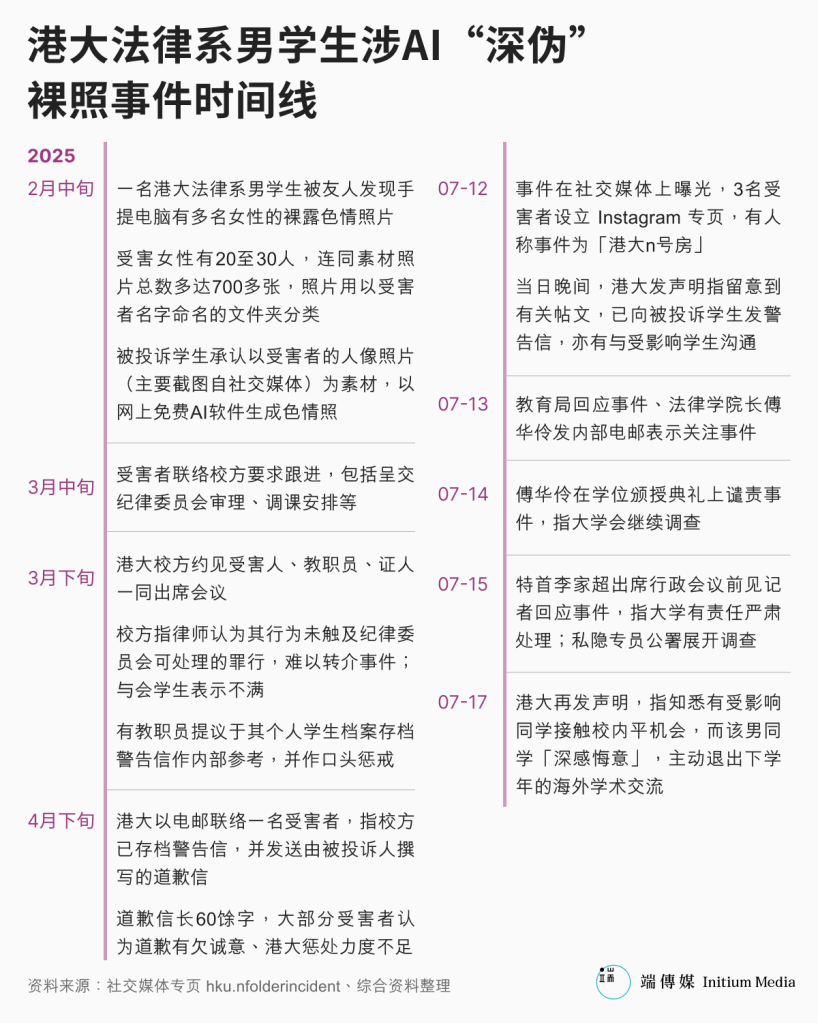 7月12日,Instagram 帐号“hku.nfolderincident”以三名受害者的名义发表事件的简述,指控该男学生在今年2月被发现手提电脑存有多张女性的裸露色情照片。他承认以受害人的人像照片为素材,以网上免费 AI 软件生成色情照,素材照片主要截图自受害人的社交媒体。