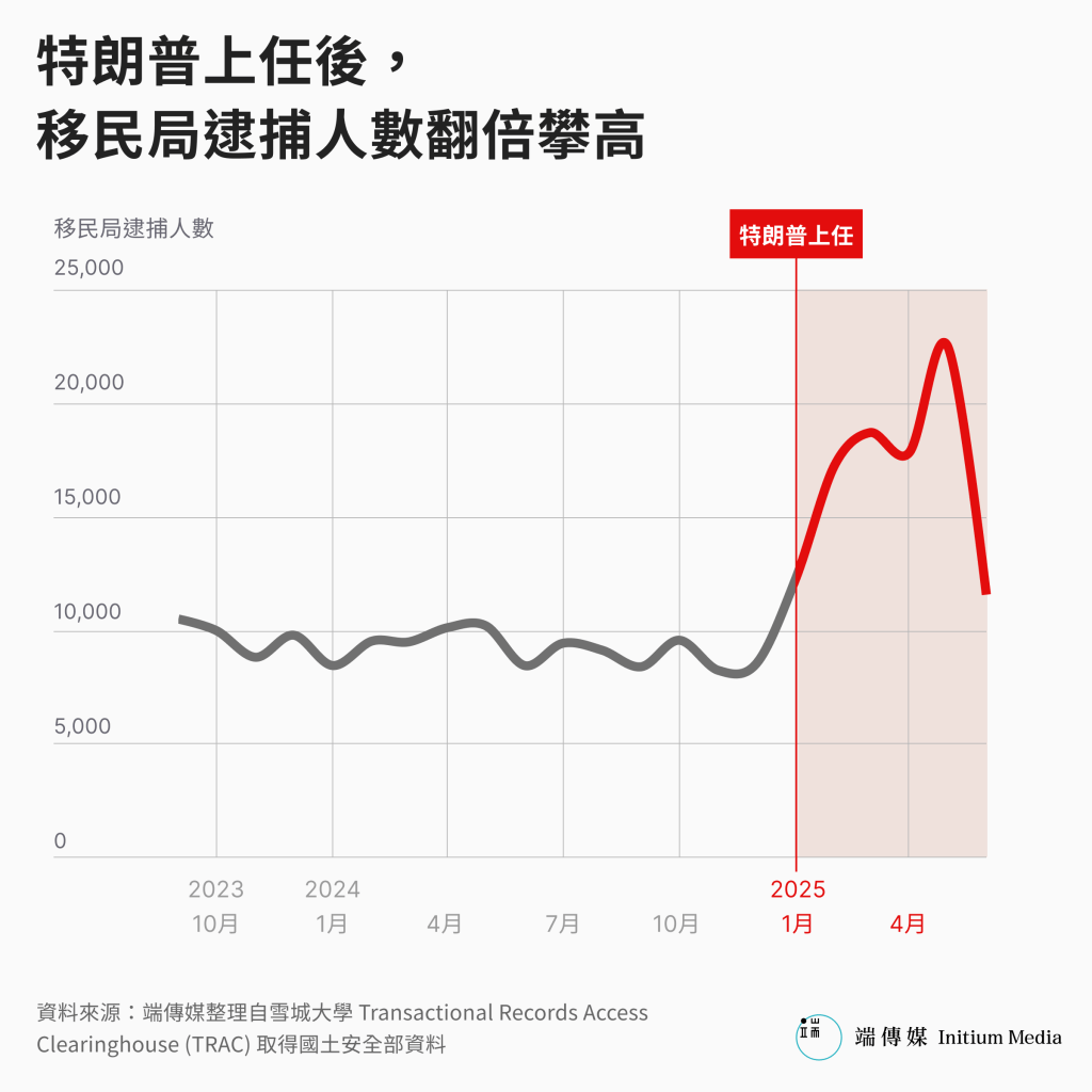特朗普於1月下旬就任後,移民局立刻展開幾波大規模的逮捕行動,並向軍隊、國稅局等其他機關調派人力,也不再只優先針對有暴力犯罪紀錄的無證移民,而是深入移民街坊鄰里,以及民主黨執政、過去對移民有較多保護措施的多個城市。在這樣的背景下,移民官員每月逮捕的總人數屢屢突破一萬五千人,甚至一度在五月衝出兩萬人的高峰。相較於拜登執政最後一年多以來每月逮捕人數「僅僅」偶爾突破一萬人大關,可以說是翻倍成長。