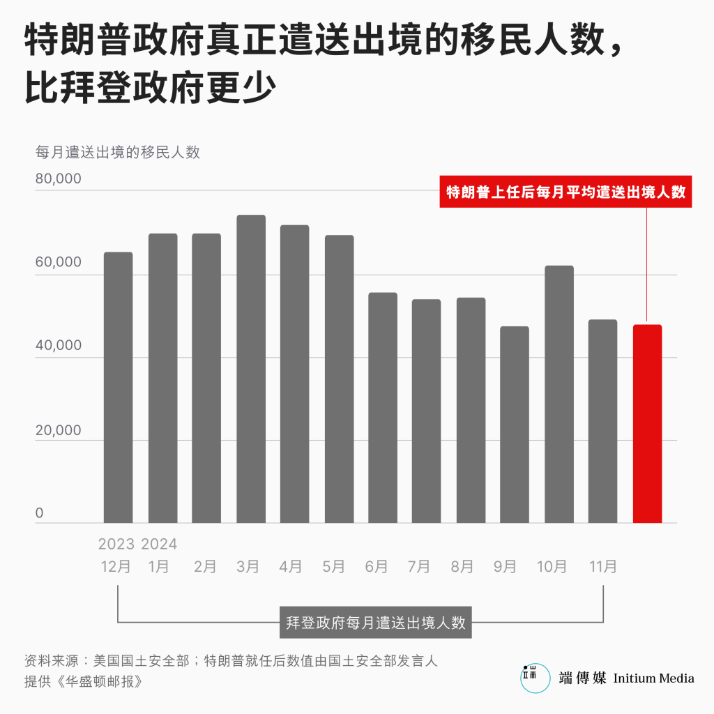 这样的结果并不令人意外:特朗普所谓的“强力执法”指的是让移民局官员在各大社区内无孔不入,开始到教堂、学校、医院等场所缉捕非法移民,并且和军队一同在镜头前展示其绝不妥协,让移民议题持续盘据在政治新闻的头版。但实际上,特朗普上任迄今每月实际遣送出境的人数,反而远比拜登政府还要少。
