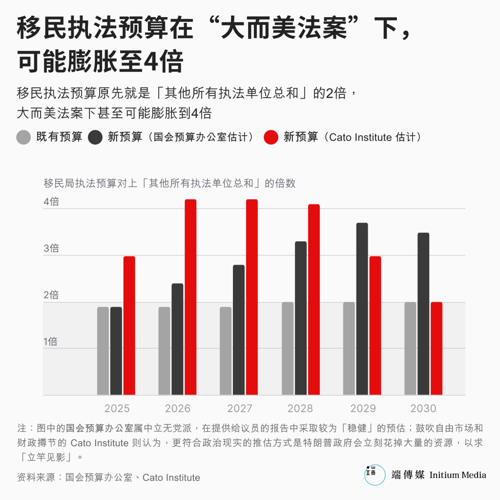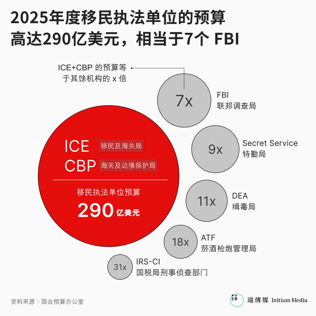 在这290亿美金的基础上,“大而美法案”还额外在未来五年为移民执法部门提供超过1,700亿美金的预算。粗略计算,“大而美法案”让移民执法部门年度可用预算骤然膨胀超过一倍──现在,移民执法部门每月的预算,将会比FBI一整年的预算还要高。这样的成长速率在公共财政上极为罕见,更是让原先已经相当伟大的移民执法部门更加伟大。