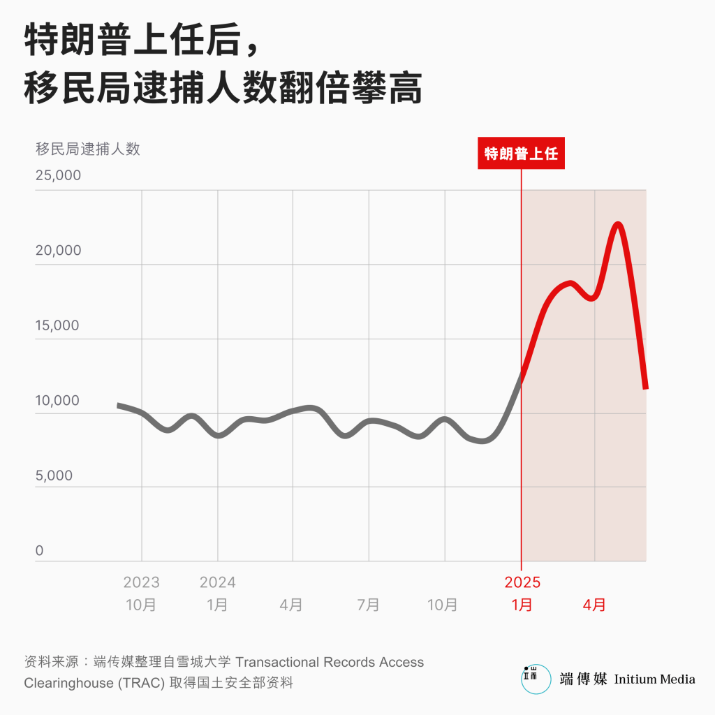 特朗普于1月下旬就任后,移民局立刻展开几波大规模的逮捕行动,并向军队、国税局等其他机关调派人力,也不再只优先针对有暴力犯罪纪录的无证移民,而是深入移民街坊邻里,以及民主党执政、过去对移民有较多保护措施的多个城市。在这样的背景下,移民官员每月逮捕的总人数屡屡突破一万五千人,甚至一度在五月冲出两万人的高峰。相较于拜登执政最后一年多以来每月逮捕人数“仅仅”偶尔突破一万人大关,可以说是翻倍成长。