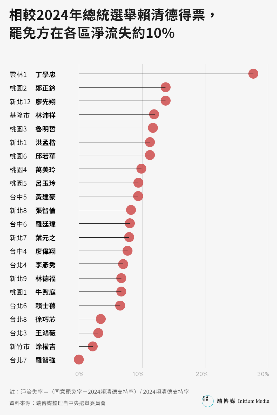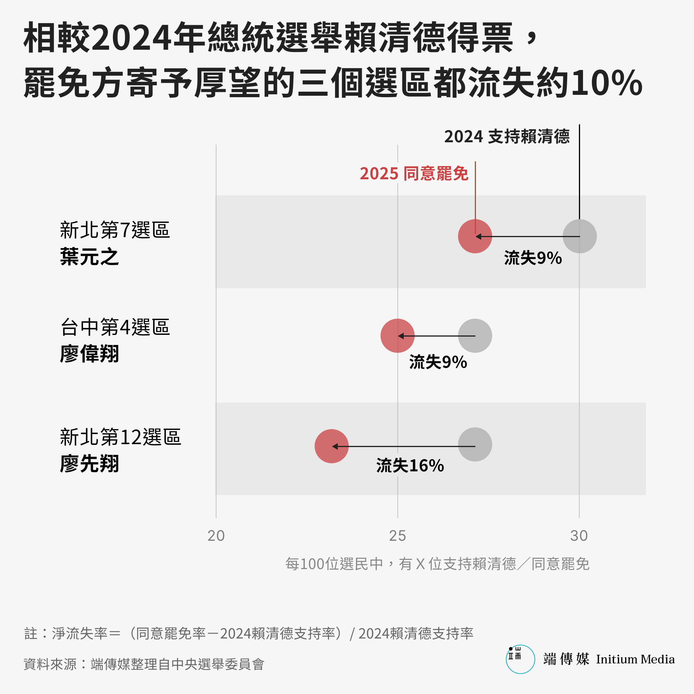 先以三個被罷免方寄予厚望的選區為例。在2024年總統選舉期間,新北第12選區藍委廖先翔的選民中,每100位約有27位願意出門把正副總統選票投給賴清德、蕭美琴。考慮到制度門檻,罷免方本來就只能夠容許流失約7%的賴蕭選民,但最後流失的比率多出了底線的一倍以上,來到16%。