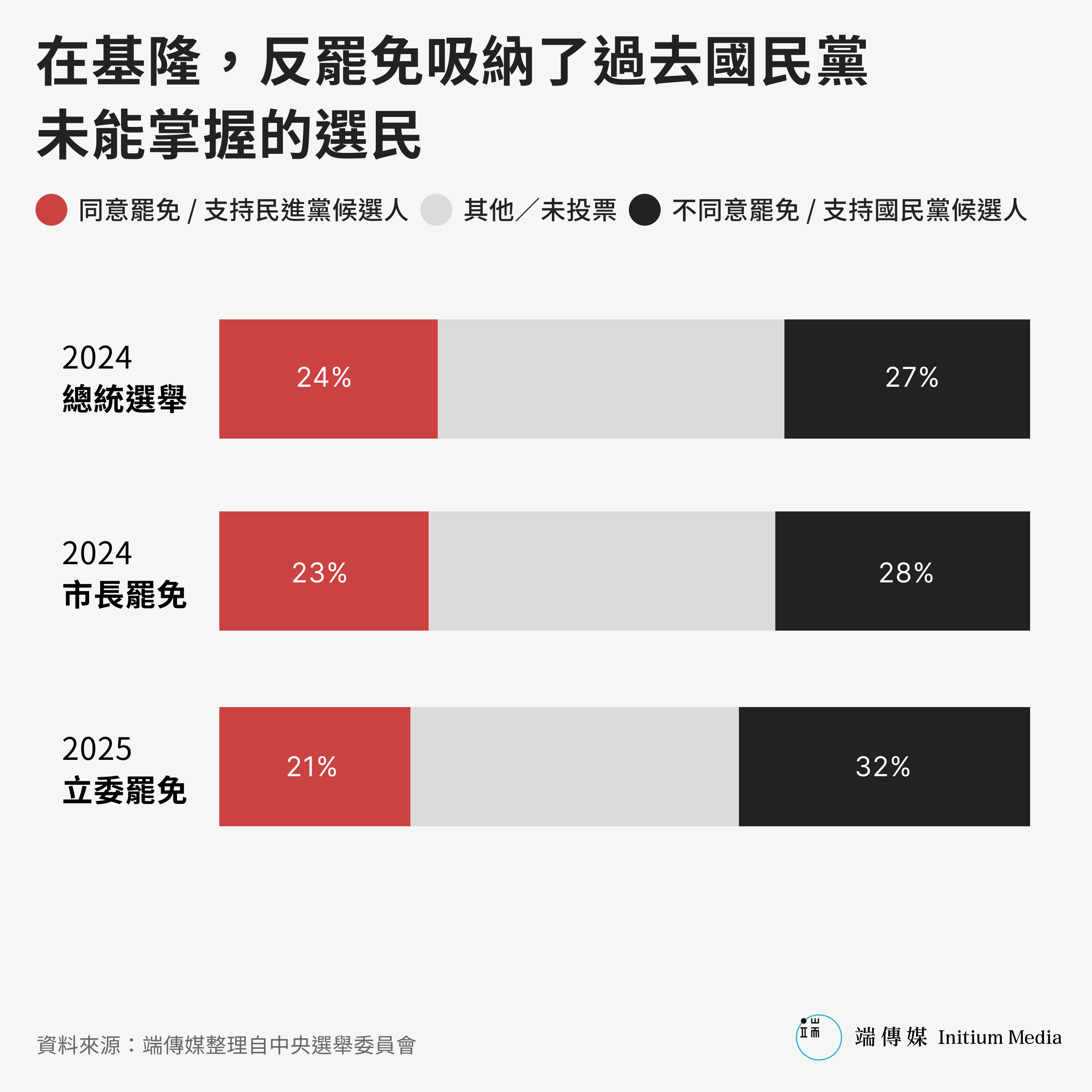 但2025年基隆的立委罷免又呈現新的轉折。不僅如前所述,罷免方只從100位選民中取得21位的支持,與總統大選時的賴蕭得票相比流失了約13%;同時,反罷免方反倒從100位選民中取得32位的支持,與總統大選時的侯友宜得票相比反倒增加了19%。這是去年年底罷免謝國樑時都尚未出現的現象——非「正藍軍」的選民出手相助,讓國民黨方的選票大幅增加。