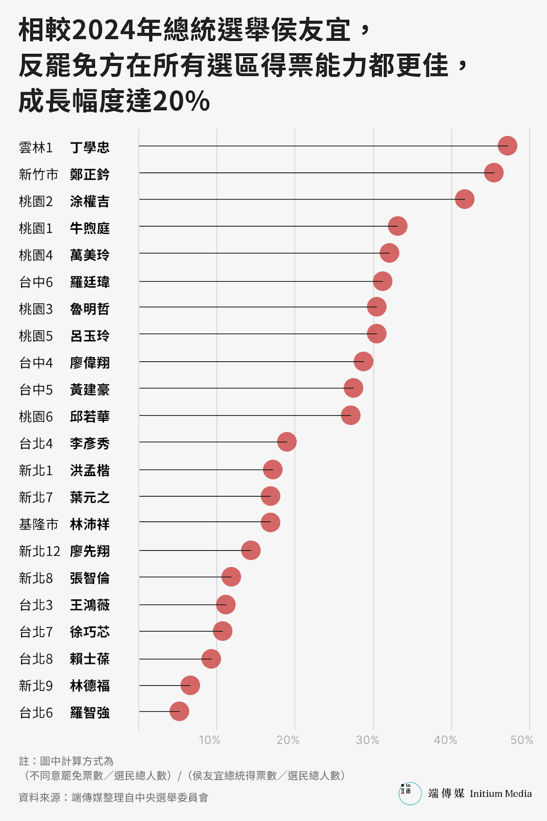 (編按:此一分析必須排除花蓮、台東兩選區,因為這兩個選區原住民族選民人數較多,而原住民族選民可以參與總統投票,但無法參與區域立委的選舉與罷免,而是參與原住民立委選舉。)