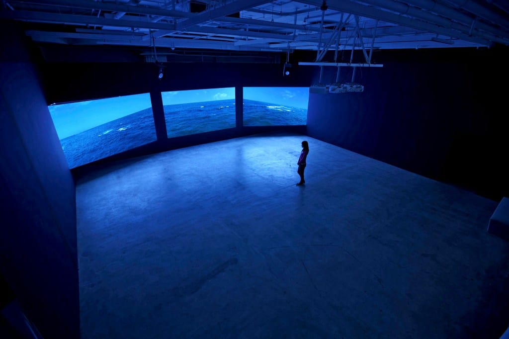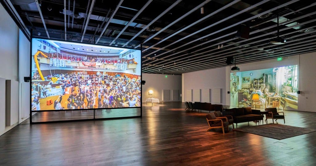 這次舊金山版本的展覽,在威尼斯雙年展的基礎上又增加了兩件作品,分別位於展廳之外與展館之外,似乎刻意不去打擾雙年展的布局原樣。一路走入,主展場呈現的是藝術家自2014年以來的重要創作,包括六件單頻錄像作品、一件LED錄像裝置、一件動力裝置及一幅素描。