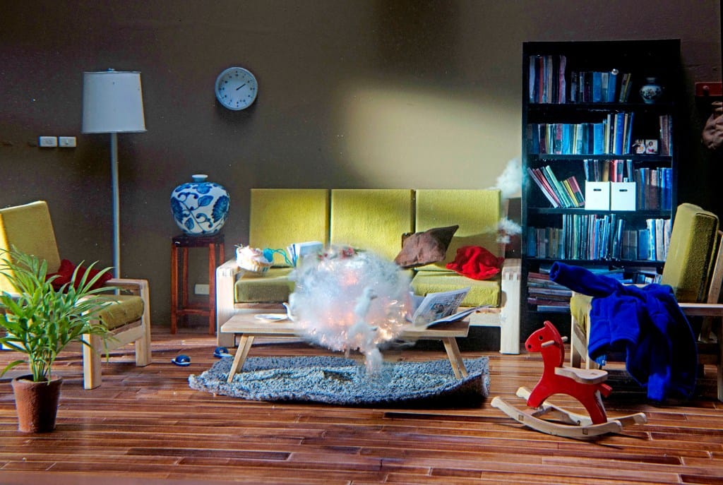 对于《日常战争》中的爆破场景,艺术家通过慢镜头,将原本眼睛与大脑来不及感知的爆破瞬间,放缓到可以被注视、观察的节奏。单身公寓主人并不在场,茶几上的电脑仍打开著,电视正在播放一款战争游戏介绍,茶杯随手放在报纸上,一切都显示他只是暂时离开。