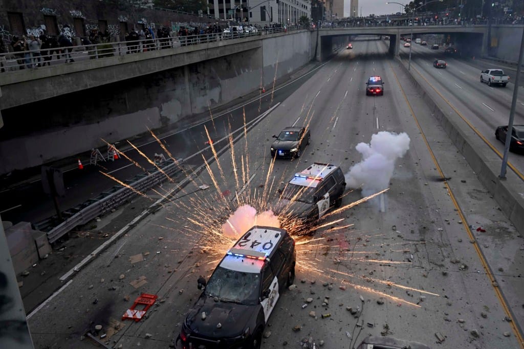 6月6日,數千名居民走上街頭,抗議ICE在洛杉磯多個區域展開突擊執法逮捕無證移民。在關押無證移民的市中心聯邦監獄周邊,抗議者的怒火宣泄於牆面,四處可見塗鴉與標語;空氣中瀰漫着被點燃汽車殘骸的焦味,地面上散落着塑膠子彈,這樣的混亂持續整整一週。直到洛杉磯市長Karen Bass對市中心實施宵禁,動盪局勢才逐漸平息。