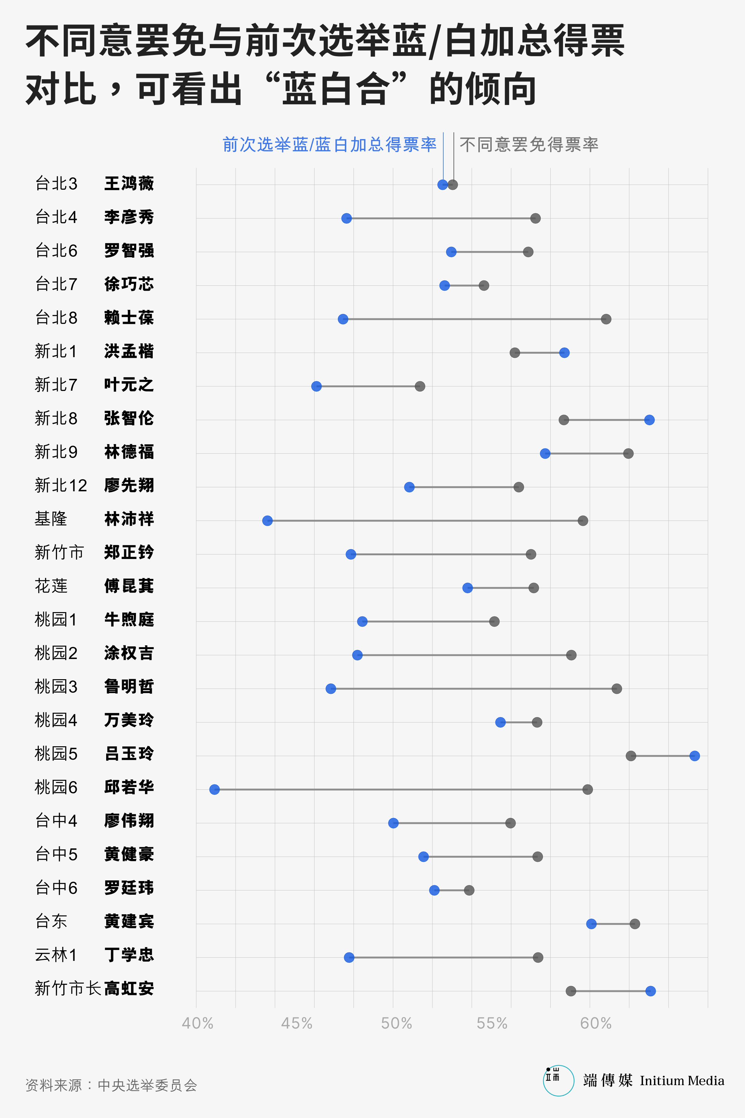从下图可以清楚看出,这次罢免案的开票结果显示蓝白合,甚至在大部分选区还加上了中间选民的支持,完封了这次的罢免案。