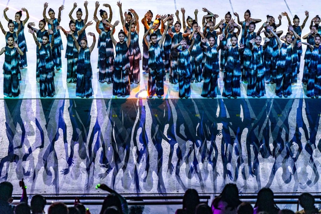 4月20日当天在台北小巨蛋内举办的全中运开幕典礼中,由台北市中正高中舞蹈班学生演出舞作《历史与大地的对话-台北印象》之后,向观众挥手致意。摄:陈晓威/报导者【体育类 亚军】汪佳燕/路透社