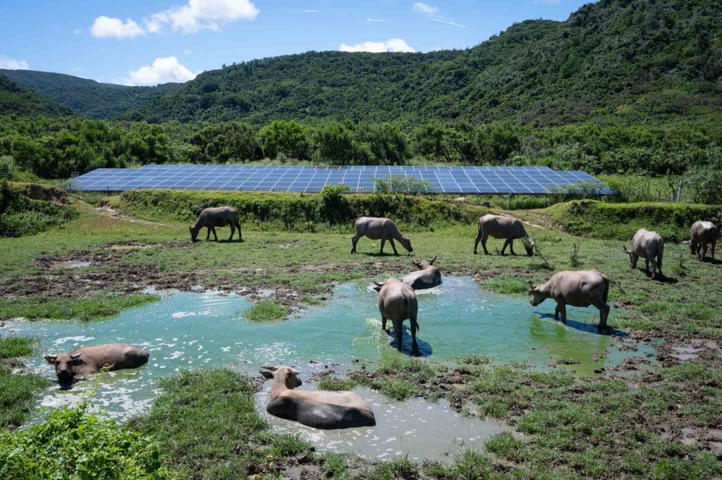 太阳能光板若过多土尘会影响太阳能板效率,若种植草可以减缓尘土遮蔽。但光板如果长期被杂草遮挡,被遮蔽的太阳能光板会产生“热斑效应”毁损组件,影响发电效益。有民间业者发展出“牛电共生”的方式,借由牛只吃草,节省除草经费。摄:林彦廷/报导者【艺术文化与娱乐新闻类 优选】陈晓威/报导者
