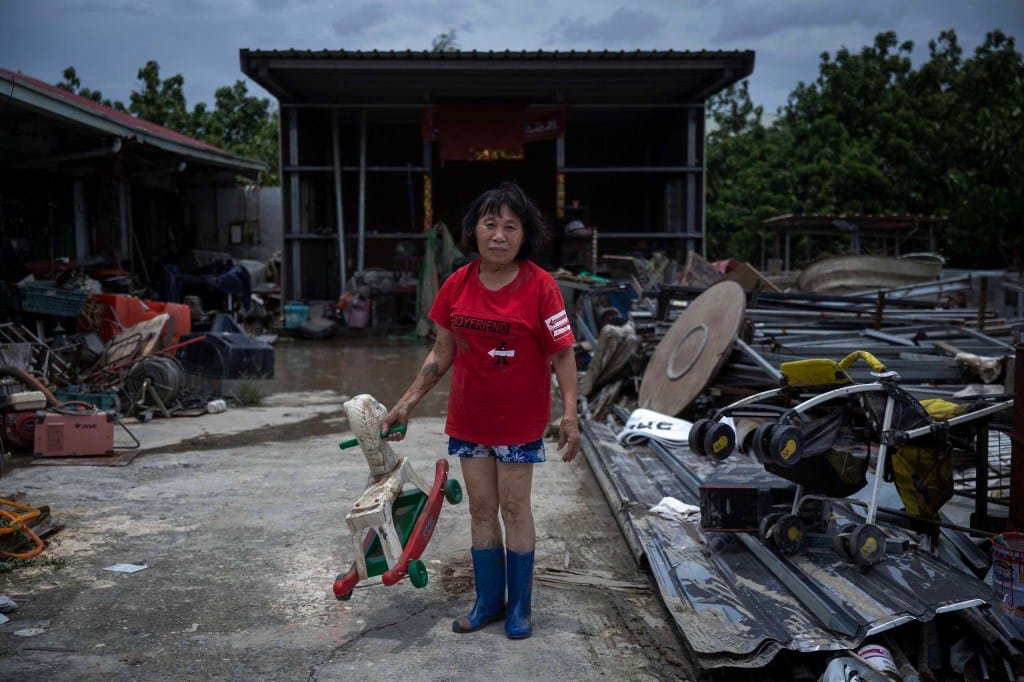 2024年7月27日,嘉义水上乡,台风凯米袭台后,老人在自己的家门前,她的家因淹水而损坏,家具及神像暂时放置屋外。摄:陈焯煇/端传媒