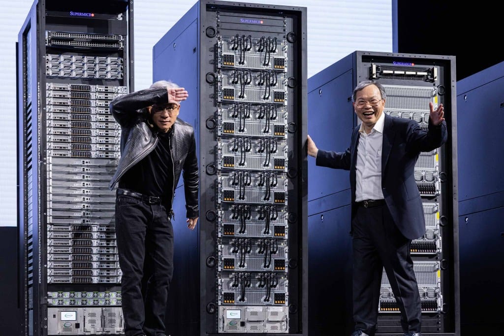 美超微(Supermicro)总裁暨执行长梁见后(右)6月5日上午在台北举行主题演讲,邀请辉达(NVIDIA)执行长黄仁勋(左)站台,黄仁勋确认摄影机位置。摄:翁睿坤/中央通讯社【突发新闻类 冠军】谢佳怡/辅仁大学新闻传播学系
