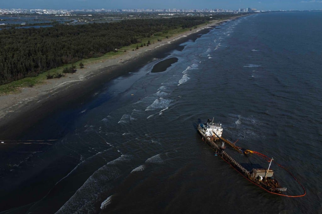 2024年8月3日,台南, 多哥籍货轮苏菲亚号受台风凯米影响搁浅于台南黄金海岸沙滩。摄:陈焯煇/端传媒