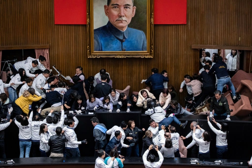 2024年12月20日,台湾台北,立法院因审议选罢法、宪诉法和财划法三项争议法案爆发冲突。19日晚间,民进党立委砸窗堵门阻止会议。20日议场内,民进党立委与国民党、民众党立委抢占主席台,互相推挤导致受伤,场面混乱。摄:陈焯煇/端传媒