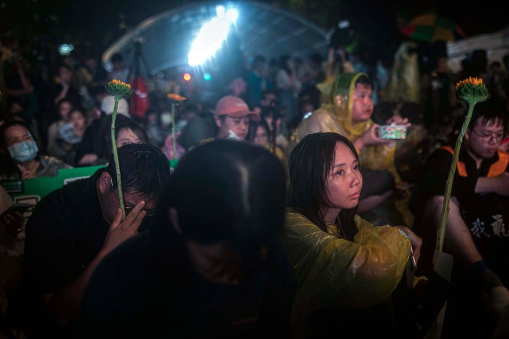 2024年12月20日,台北,在民众党及国民党的赞成下,立法院三读通过《选罢法》、《宪法诉讼法》、《财划法》修法,有民间团体号召市民于立法院外上街示威,寒夜下大批示威者集会,部分民众带同追星的应援棒参与。摄:陈焯煇/端传媒