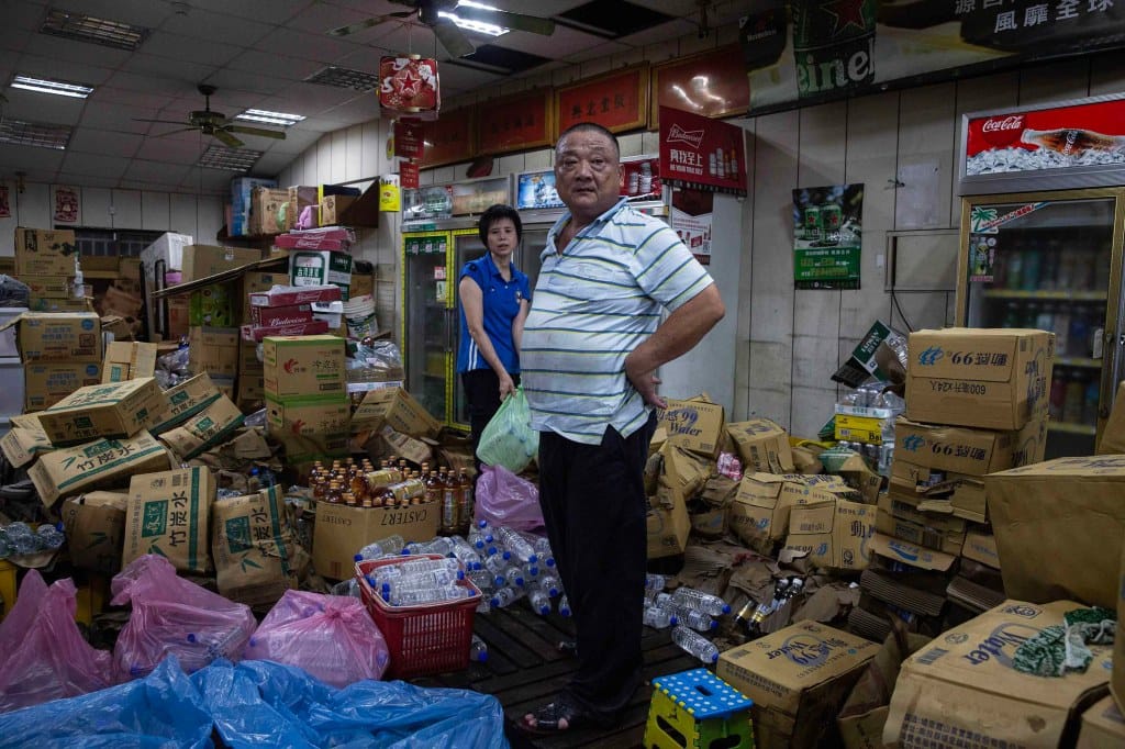 2024年7月27日,台南盐水,淹水后的一间超市,老板在整理灾后的店。摄:陈焯煇/端传媒