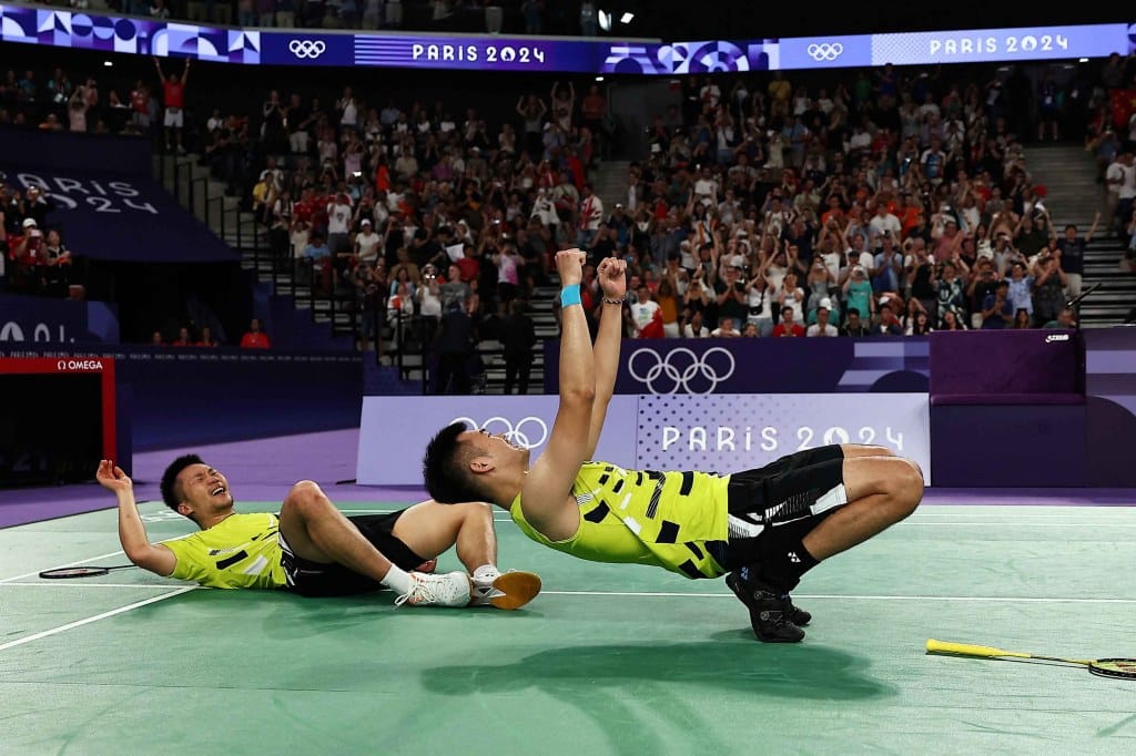 2024年8月4日,法國巴黎,巴黎奧運男子雙打金牌爭奪賽,台灣選手李洋和王齊麟與中國選手梁偉鏗和王昶比賽,於奪得勝利後慶祝。攝:汪佳燕/路透社【當代熱點類 冠軍】陳曉威/報導者