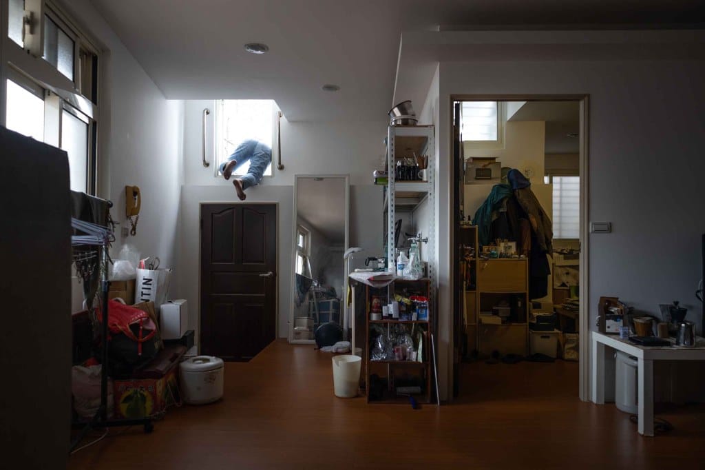 新北市菜寮頂樓加蓋,正在爬出維修孔的住戶。攝影:蔡昕翰