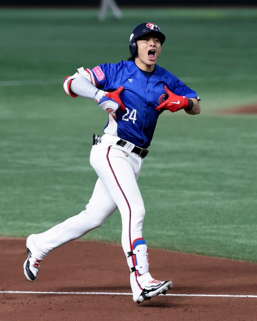 2024年11月,世界棒球12強賽,陳傑憲在冠軍戰擊出三分全壘打後的慶祝動作。攝:侯禕縉/喜多運動 Hit SPORTS【年度最佳新聞攝影作品集】Daniel Ceng/Anadolu Ajansi