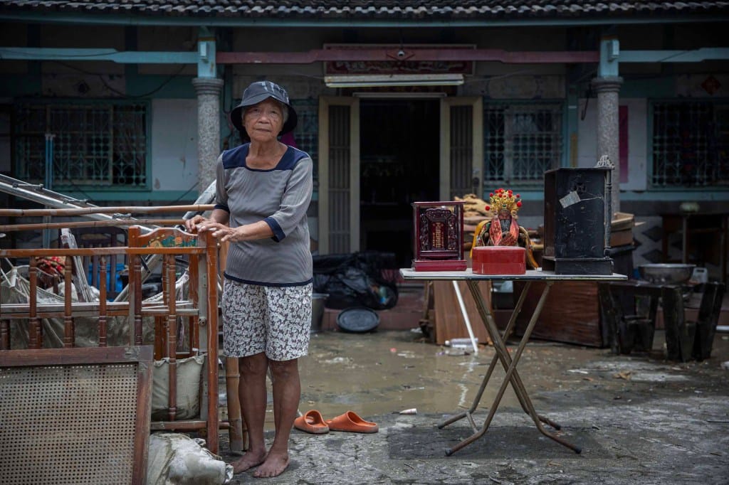 2024年7月27日,嘉義水上鄉,颱風凱米襲台後,老人在自己的家門前,她的家因淹水而損壞,家具及神像暫時放置屋外。陳焯煇/端傳媒