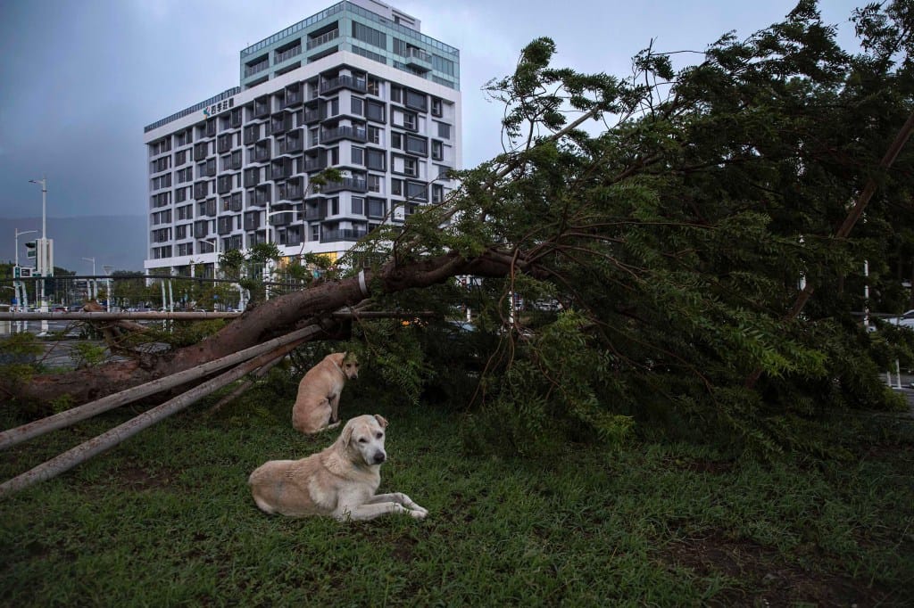 2024年7月26日,高雄,颱風凱米襲台後,流浪狗在一棵倒掉的大樹下休息。陳焯煇/端傳媒