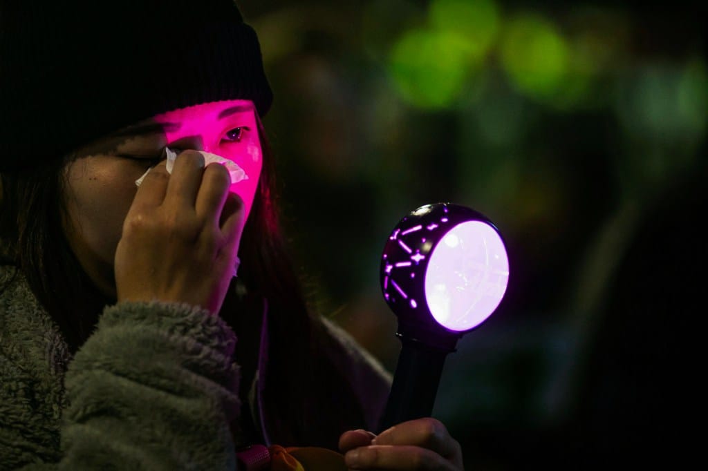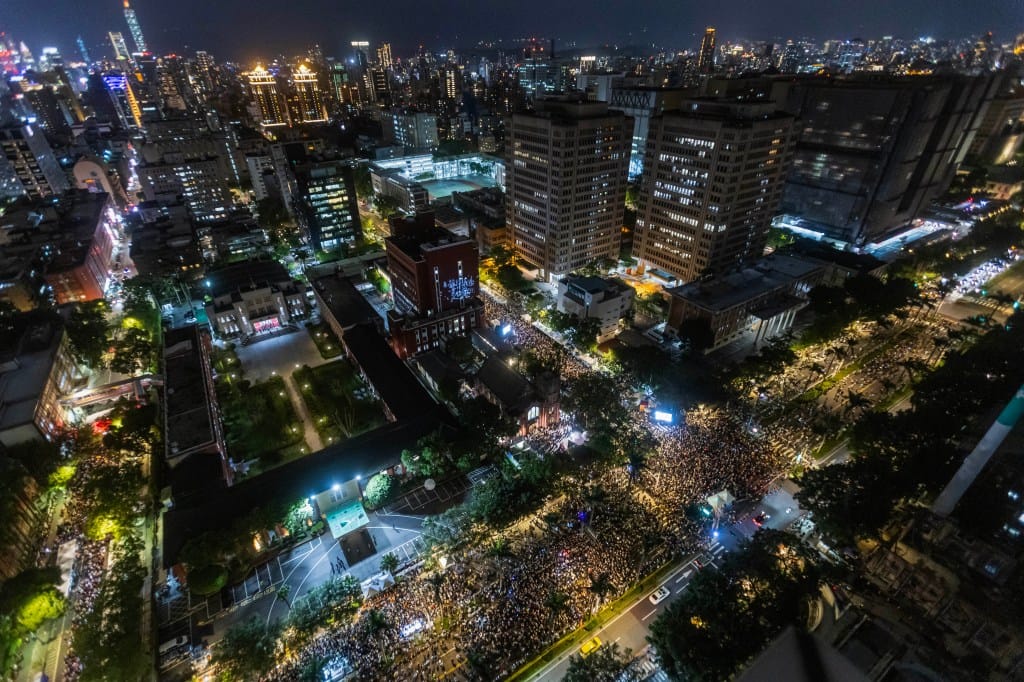 2024年12月20日,台北,在民衆黨及國民黨的贊成下,立法院三讀通過《選罷法》、《憲法訴訟法》、《財劃法》修法,有民間團體號召市民於立法院外上街示威,寒夜下大批示威者集會,部分民衆帶同追星的應援棒參與。攝:陳焯煇/端傳媒