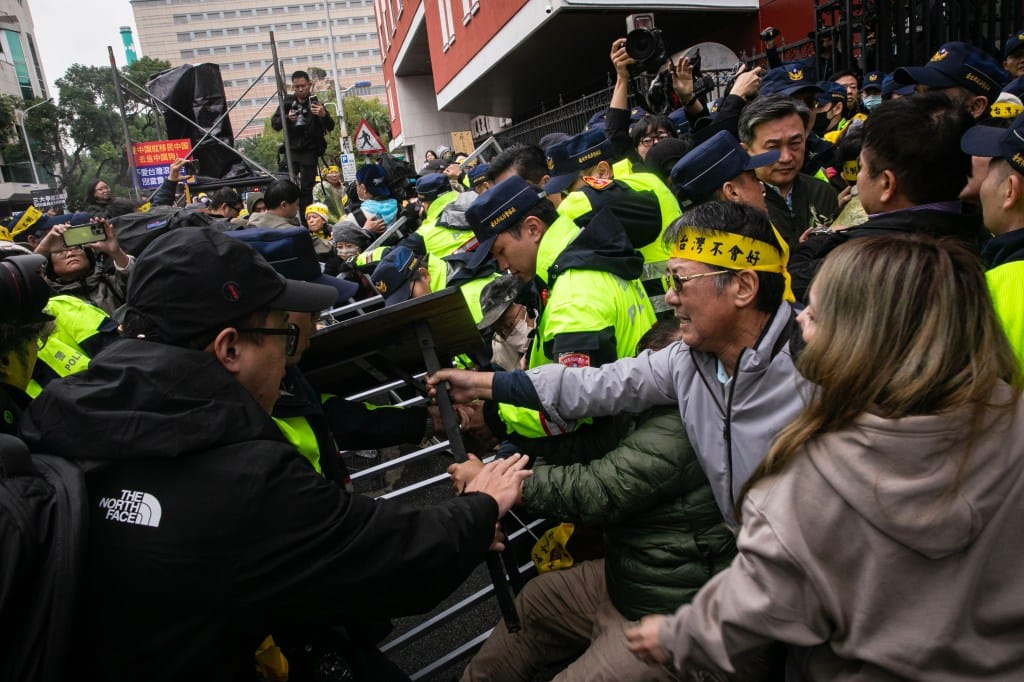 2024年12月20日,台北,立法院今天預計處理選罷法、憲法訴訟法及財劃法等修正草案,立法院外有民間團體和民進黨支持者集會示威,示威者一度與警方推撞。攝:陳焯煇/端傳媒