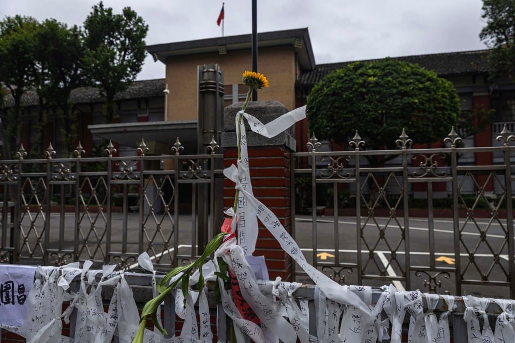 2024年5月28日,台北,立法院進行改革法案審議,民眾在立法院外繫上白布條。攝:陳焯煇/端傳媒