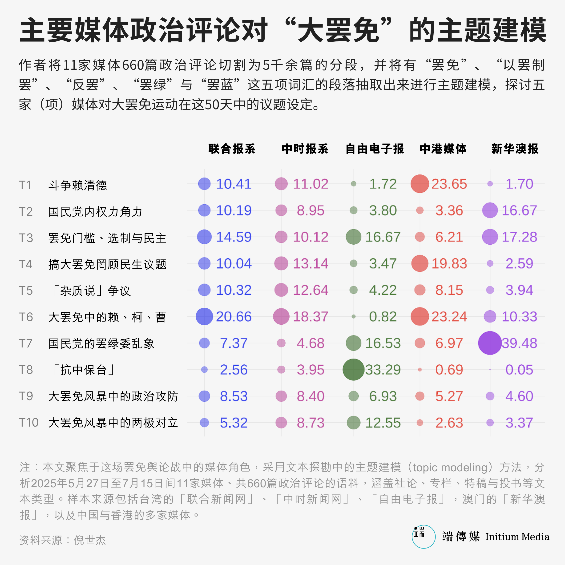 本文聚焦于这场罢免舆论战中的媒体角色,采用文本探勘中的主题建模(topic modeling)方法,分析2025年5月27日至7月15日间共11家媒体、共660篇政治评论的语料,涵盖社论、专栏、特稿与投书等文本类型。样本来源包括台湾的“联合新闻网”、“中时新闻网”、“自由电子报”,澳门的“新华澳报”,以及中国与香港的多家媒体。这些媒体中,仅“自由电子报”表现出支持罢免的立场,其余皆偏向反罢免或对执政的民进党政府与赖清德总统进行强烈批评。