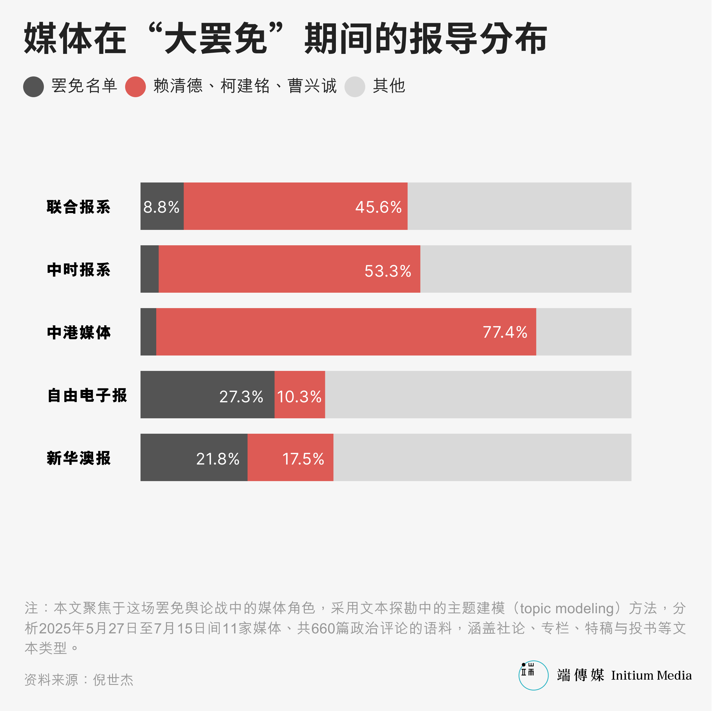 结果显示,在所有提及人名频率中,“赖、柯、曹”类在中港媒体的出现率高达77.4%,“中时”与“联合”分别为53.3%与45.6%,远高于“自由电子报”的10.3%。在“自由”,被罢蓝委(含新竹市长高虹安)相关人名的词频比率高达27.3%,而“新华澳报”也有21.8%。但“联合”、“中时”与中港媒体对蓝委姓名的提及则明显压低,分别仅为3.2%、3.7%与8.8%。