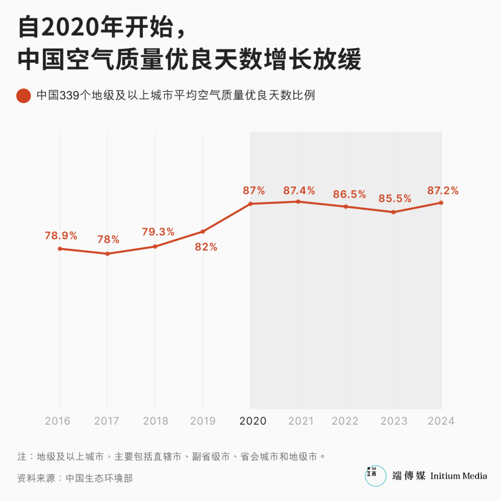 但自 2021 年起,这一改善趋势明显减缓。端传媒整理中国 339 个地级及以上城市数据,发现 2016 年至 2020 年间,空气质量为优和良的天数比例由 78.9% 上升至 87%,此后这一指标在 87%上下浮动,未有显著进步。