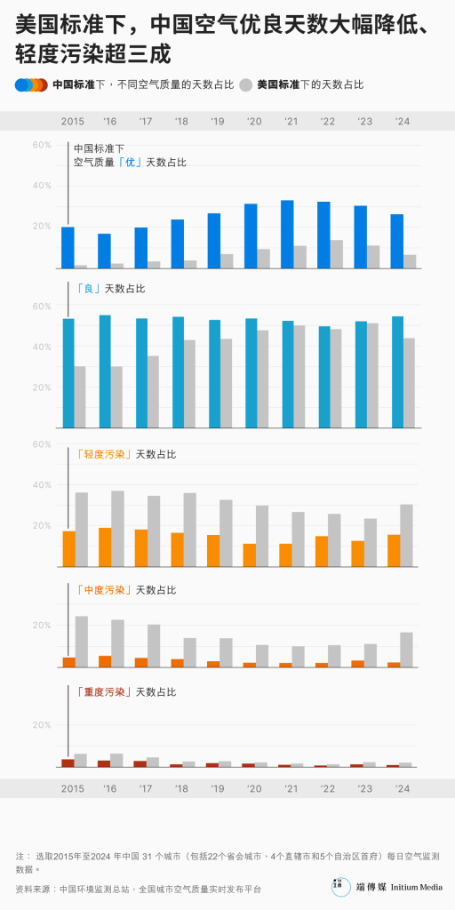 但在更严格的美国标准下,优良天数的占比被极大压缩,轻度污染在多数年份占比超过三成,重度污染与严重污染也不再只是极少数。